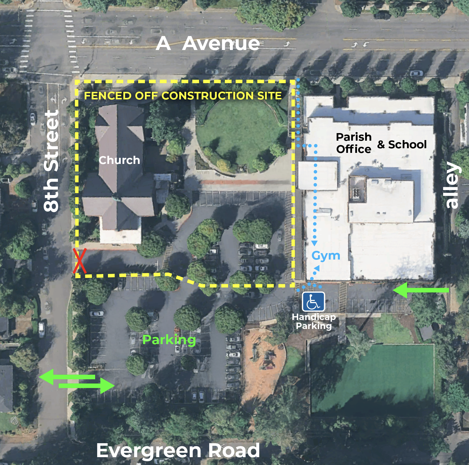 gym or enter through the rear gym entrance at the corner of the building adjacent to the playground. Handicap parking will be added to the gym entrance area. (There is also an elevator to get from the main entrance level down several steps to the gym level.) Please use all caution when driving in the parking lot since there will be more people walking through the lot to get to Mass.