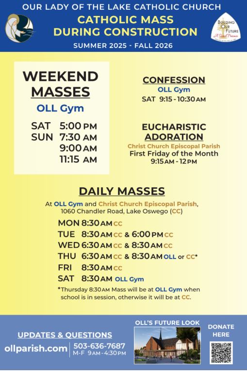 We are holding Mass in the OLL Gym on Thursdays at 8:30am (only while school is in session) and on Saturdays at 8:30am. All other Masses will be held at the Christ Church Episcopal Parish at 1060 Chandler Road, Lake Oswego.