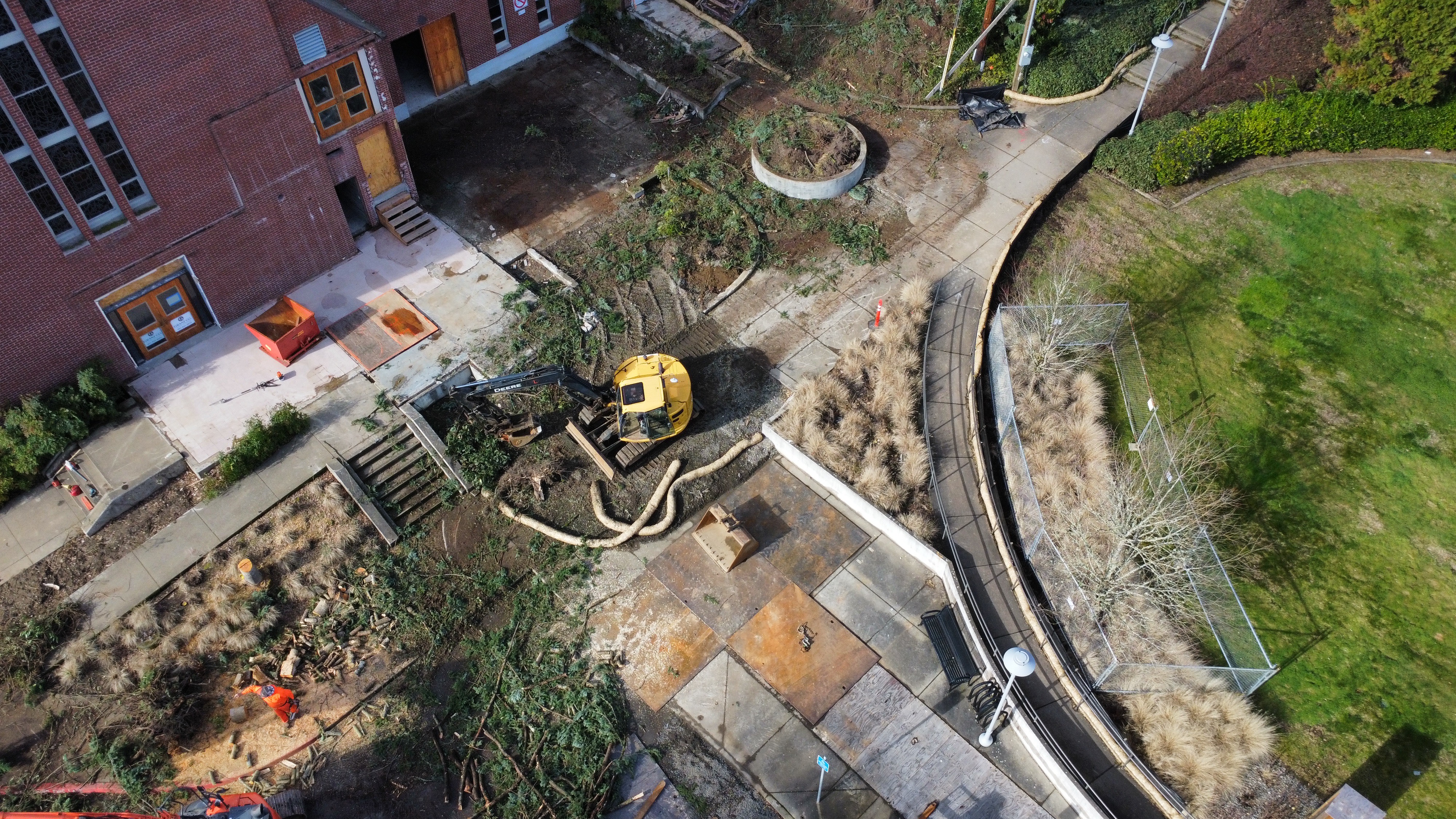 The conduit comes up at the North driveway near the back of the church at a junction box which will later be installed, and then goes back underground to cross the driveway to the church.