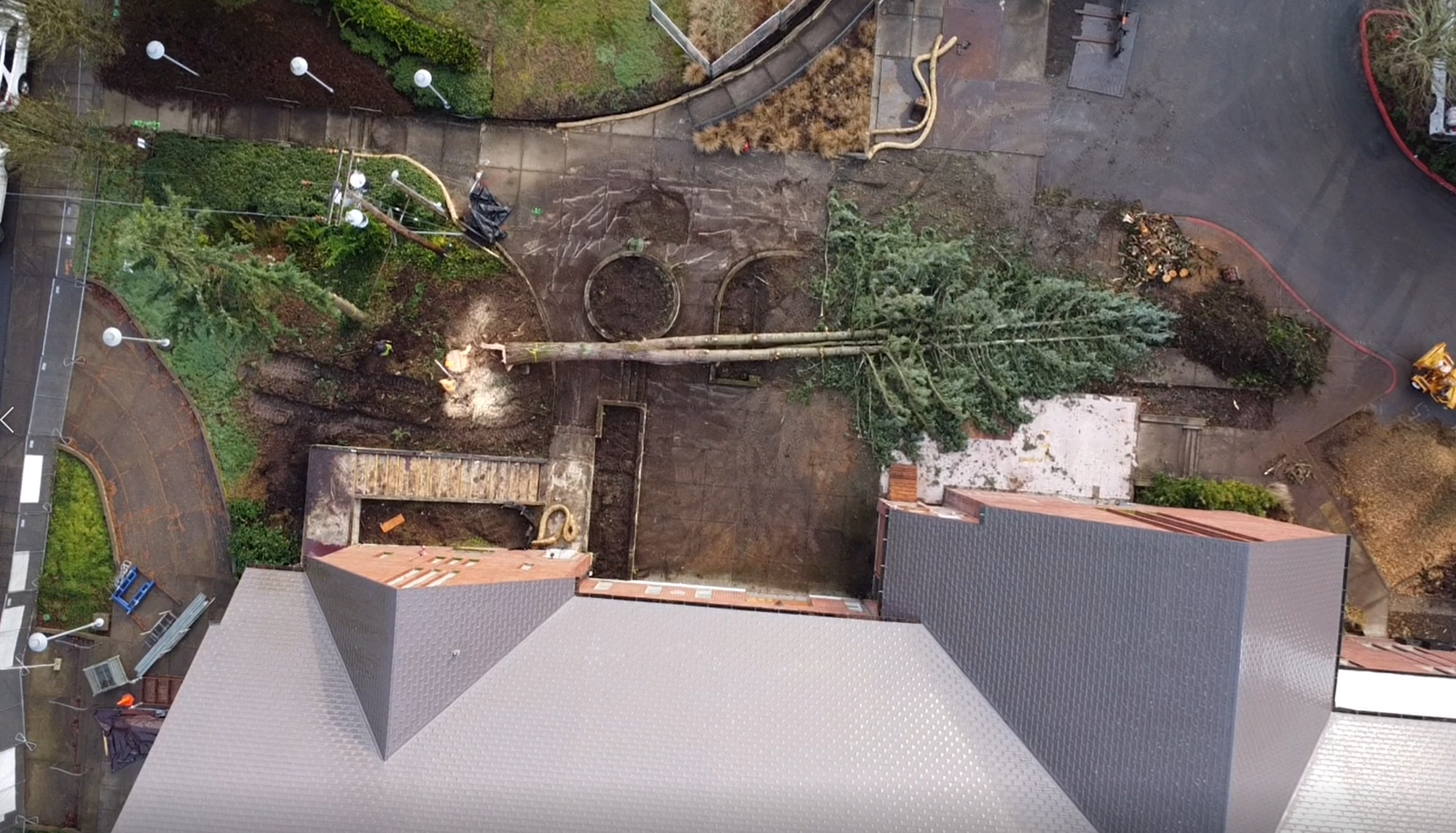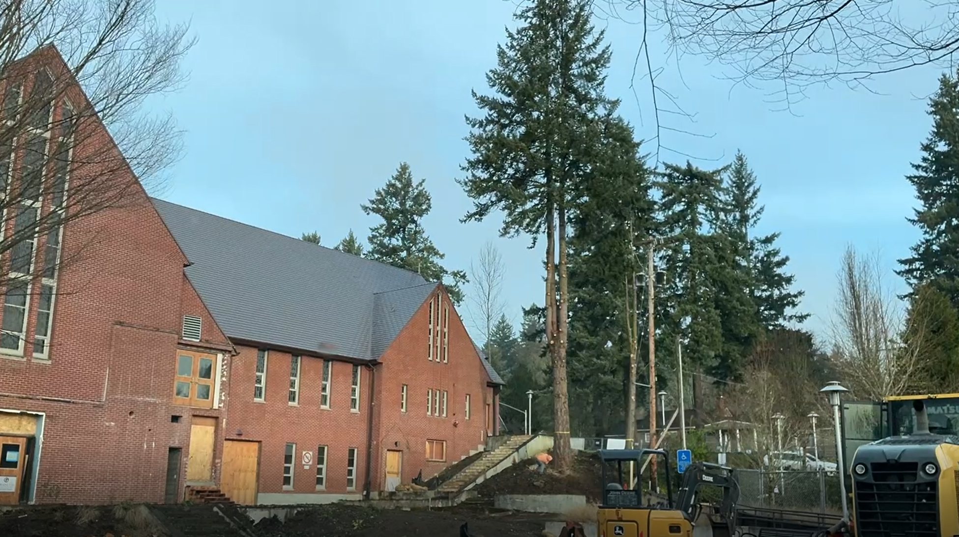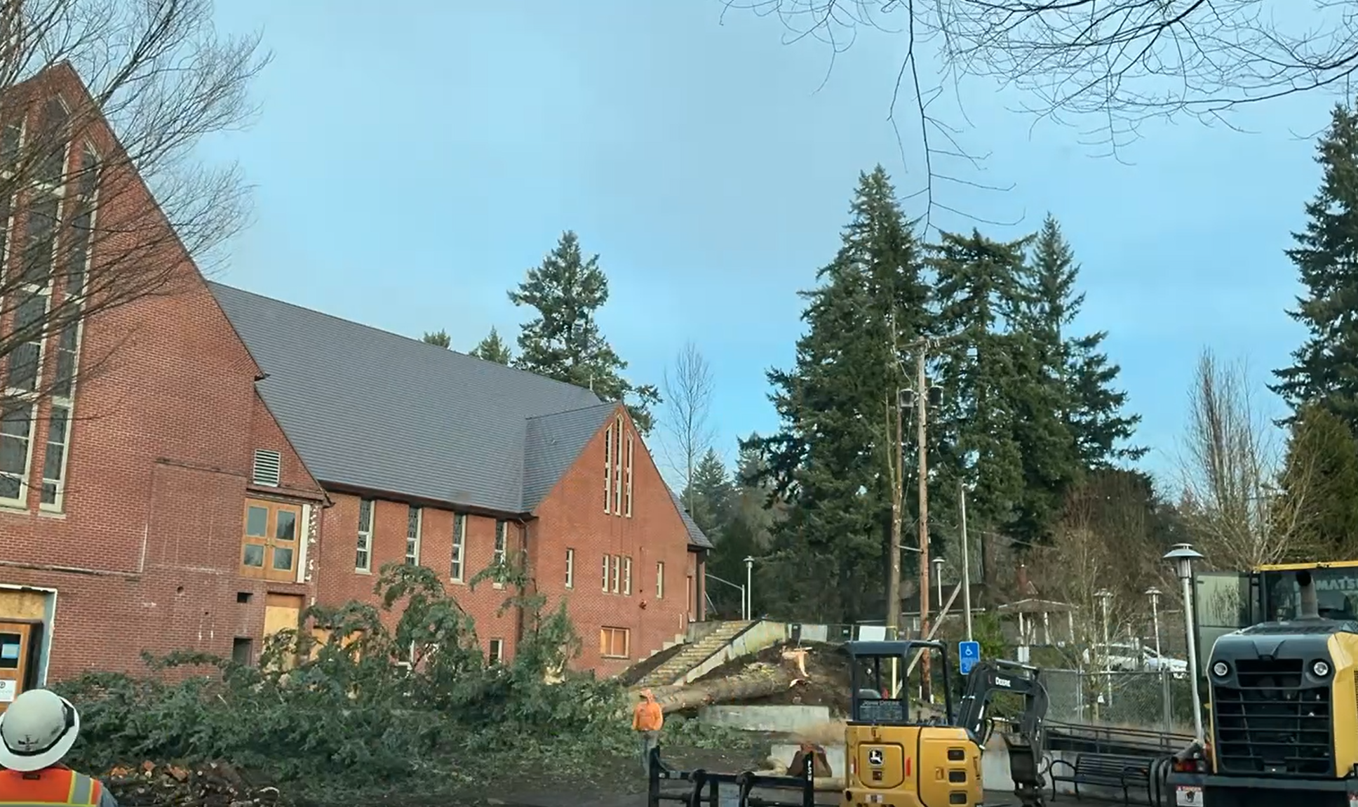 The estimated 80-foot tree near the northeast corner of the church has been felled. This is before the tree felling.